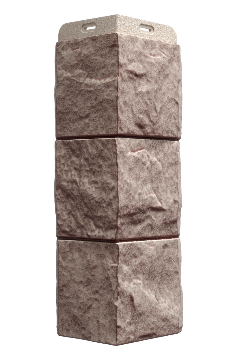 Углы в цвете «перламутровый» — идеальное дополнение для фасадных панелей с эффектом крупноформатной каменной кладки. Спокойный многогранный цвет и швы в тон материала делают стык панели и угла практически незаметным.